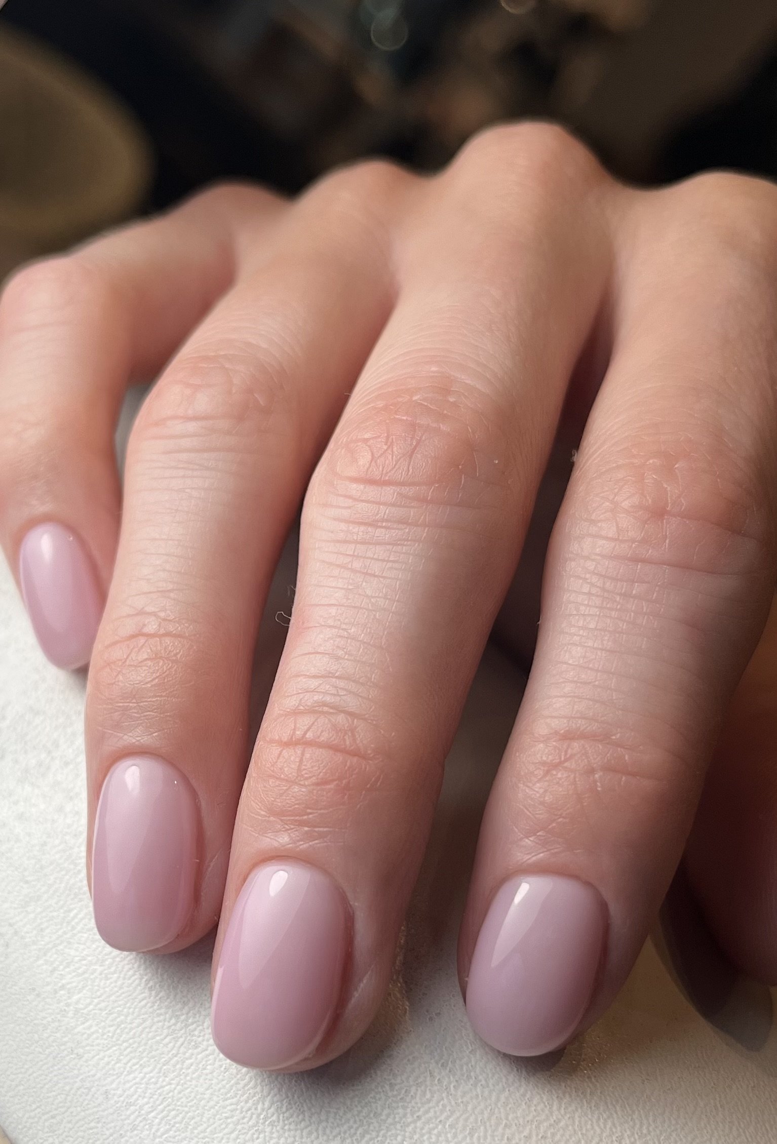 Nail shaping and preparation, gentle Russian style cuticle work, followed by application of base and choice of gel polish colour.